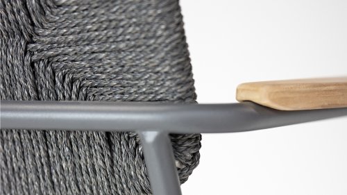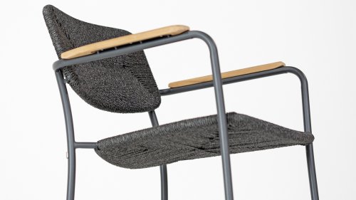 Het antraciet frame van RVS heeft een sterke maar minimale en industriële look door de dunne ronde buizen. De afgeronde hoeken geven het nog steeds wel een vriendelijk karakter. Het materiaal van de Bora stoel is uniek in onze collectie. Het is een gedraaide vlechtwerk-draad. Het geeft de Bora stoel een natuurlijk touw-achtig uiterlijk. Zowel de zitting als de rugleuning is gemaakt van dit materiaal en ook de armleuning zijn omwikkeld met hetzelfde vlechtwerk.
