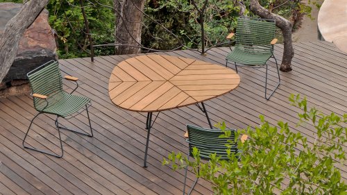 Deze unieke tafel van Houe heeft z'n naam niet gestolen, de gelijkenis met een blad is treffend... De driehoekige vorm en de plaatsing van het onderstel maken dat tot 9 personen aan de Leaf kunnen tafelen. De Leaf-tafel, naar een ontwerp van Henrik Pedersen, is vervaardigd uit grijs gepoedercoat metaal met een tafelblad vervaardigd uit bamboe-lamellen. Bamboe is een snel groeiende plant. Mits op een juiste manier manier onderhouden, maakt dit een duurzamer materiaal dan teak. We adviseren bamboe 2-3 keer per jaar te oliën, dan gaat de tafel zeer lang mee, en behoud hij zijn warme kleuren.