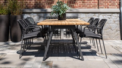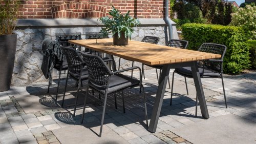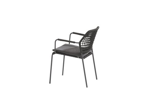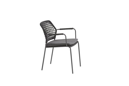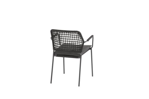 Deze stoel is er in 5 kleuren rope: Antraciet, Groen, Blauw, Frozen en Terra Cotta. Je kijkt hier naar de antraciet variant. Je kunt dus kiezen welke kleur het beste past op je terras, of je maakt een mooie combinatie van 2 of zelfs 5 kleuren. Het rope materiaal is weerbestendig en in een blok-patroon geknoopt. Het rope komt op subtiele wijze weer terug in de armleuningen.